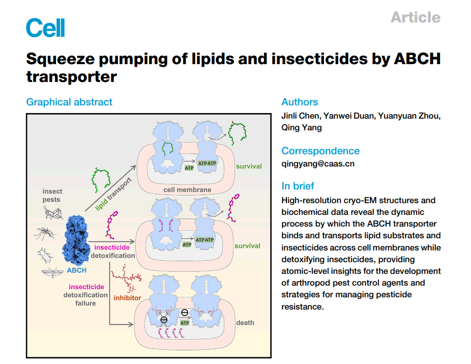 北京时间2024年12月24日24时,国际顶级期刊《细胞(Cell)》在线发表了中国农业科学院深圳农业基因组研究所(岭南现代农业科学与技术广东省实验室深圳分中心)杨青教授团队的最新研究成果,研究揭示了ABCH转运蛋白转运脂质和外排农药的分子机制,并获得了能够抑制转运功能的小分子抑制剂。简单来说,研究解析了害虫的“外部防御”和“解毒”机制,并找到了能直接用于合成绿色农药的有效成分。