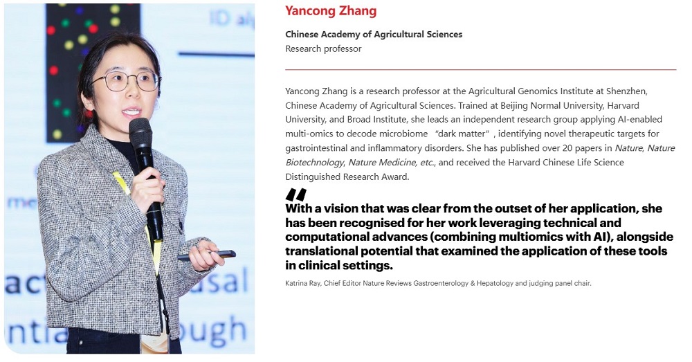 评审委员会主席、《自然综述:胃肠病学与肝病学》主编卡特里娜·雷评价:“她自申请伊始即展现出清晰而明确的研究愿景,并因其在多组学与人工智能相结合的前沿技术与计算方法创新方面的工作而获得认可,同时其工作探索了这些技术方法在临床场景中的应用,具备潜在转化价值。”